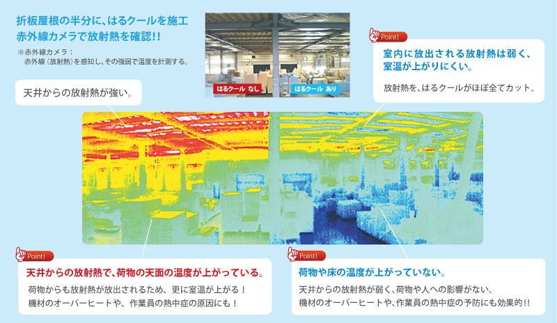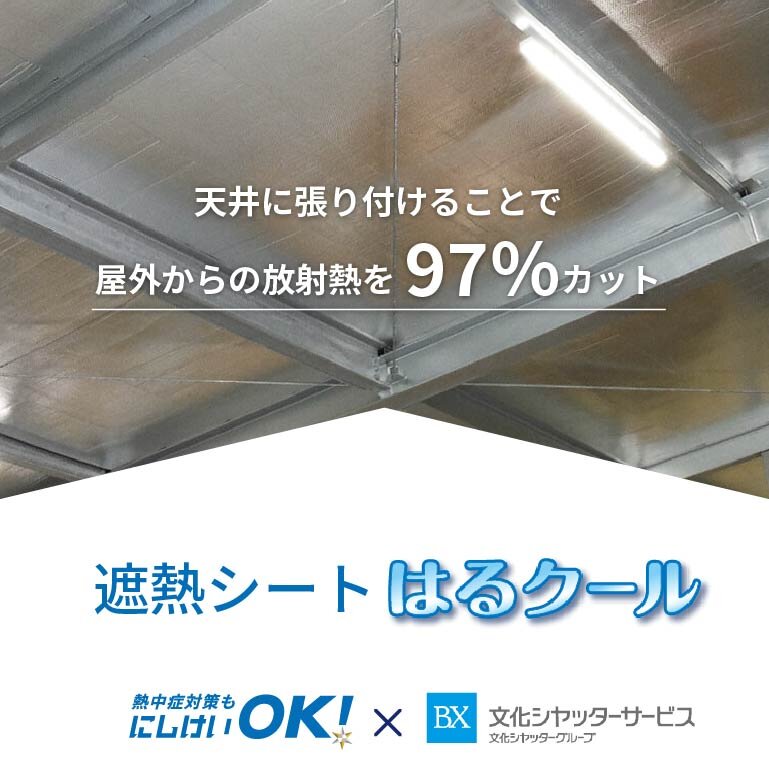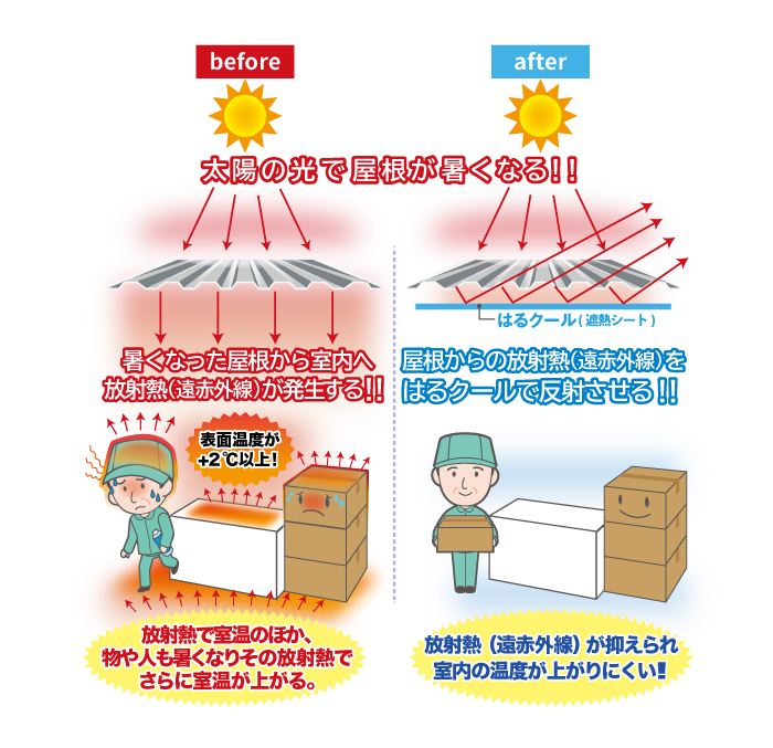 放射熱(遠赤外線)を反射することで建物内の温度上昇を抑え、熱中症の予防や荷物へのダメージ軽減、エアコン代の削減に効果を発揮します。